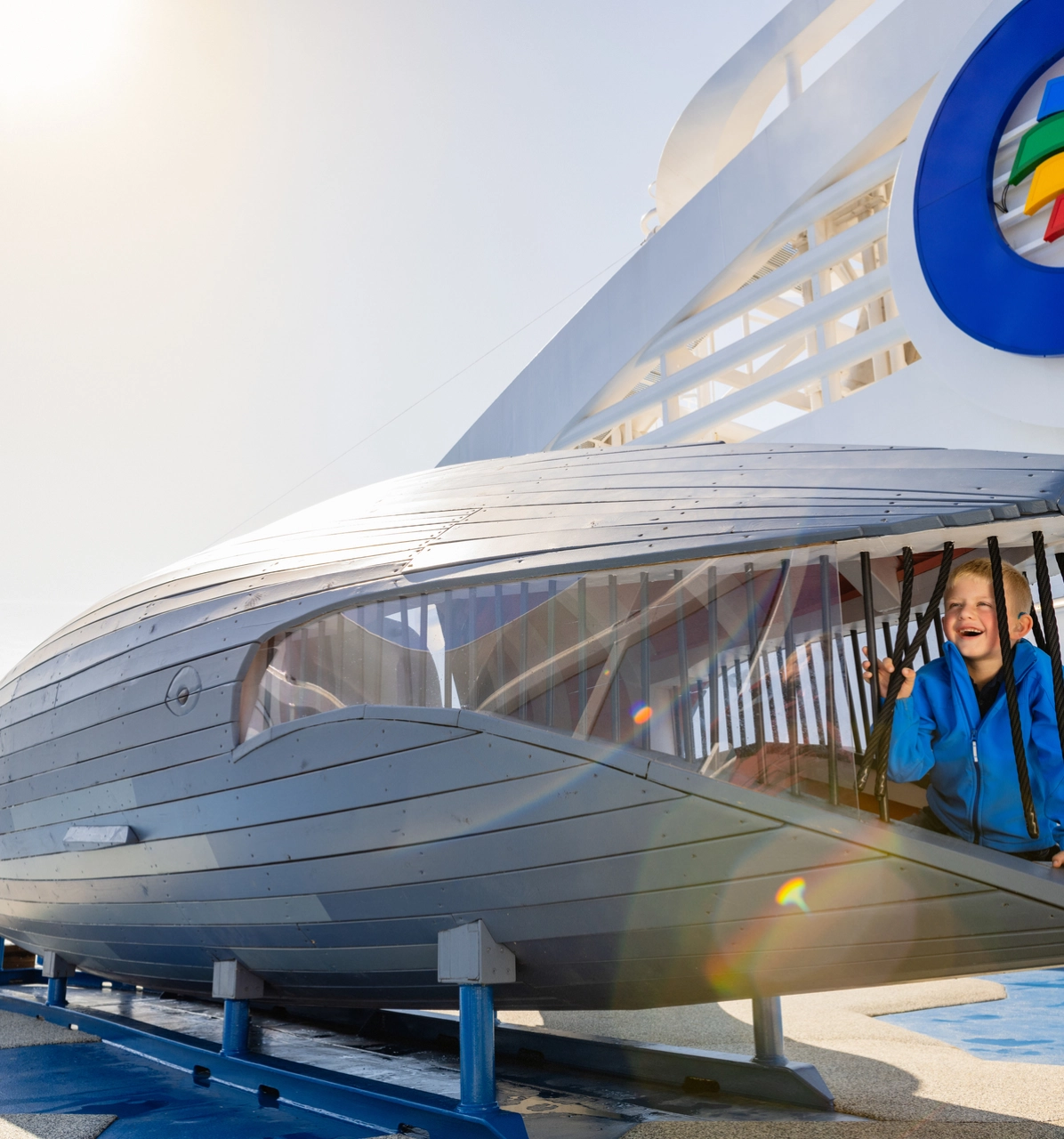 På däck finns en lekplats där barn kan leka i en stor val.